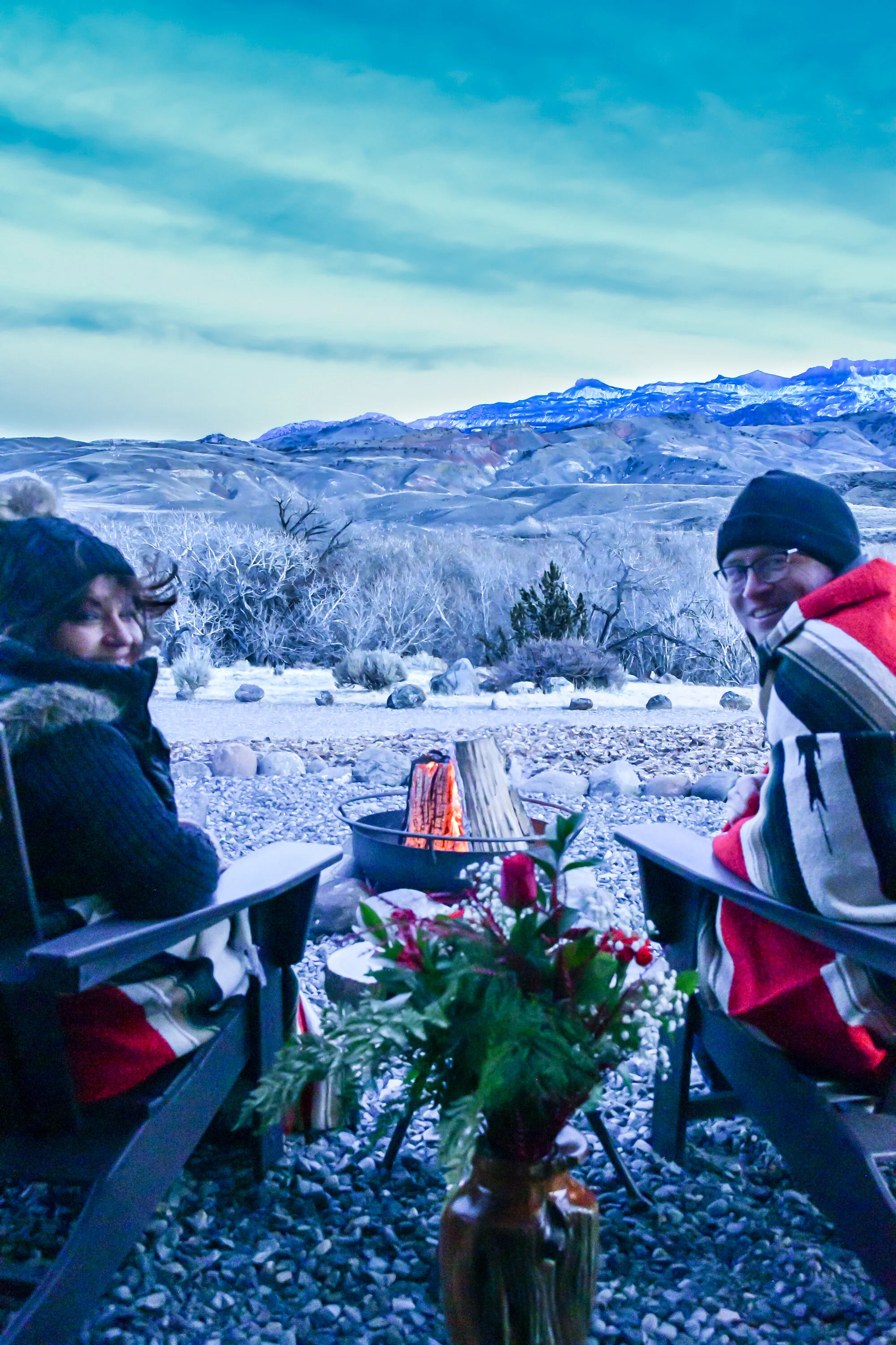 Our gracious hosts, Kenny and Marie Daniels set us up with a chic cabin at their South Fork Mountain Retreat. Outside of the cabin was a fire pit with comfortable Adirondack chairs. Dave started a cozy fire and Lisa set out the purely Wyoming charcuterie and flowers, made a tasty huckleberry daiquiri, and pulled out some wonderfully warm, hand woven hacienda-style blankets to sit by the fire.